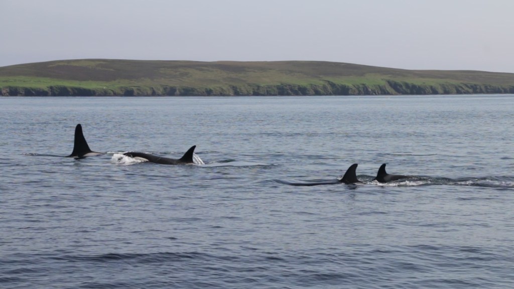 Killer whales are fast and powerful swimmers, exceeding 20-30 km/h in short bursts. But like us, or any animal, they cannot maintain maximum speeds all the time. This is especially true for group-living species that travel together; think of the #27s pod familiar from Shetland for example, which has a new calf since this summer and was spotted in Fair Isle the other day (4th Oct). They must travel hundreds of kilometres every year: the distance between Sumburgh head and Fair Isle is about 40 km, and one round trip around Shetland mainland 200 km.