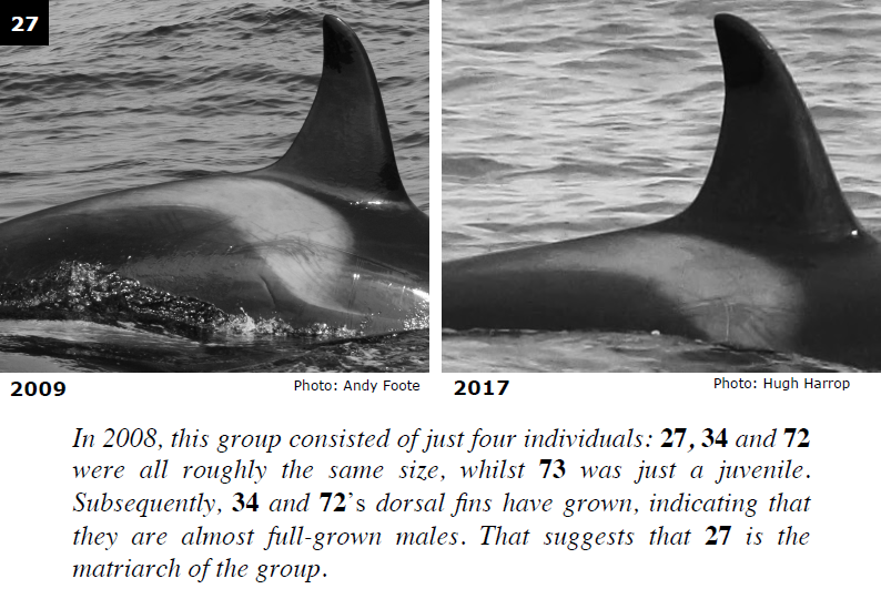 Andrew Scullion, Hugh Harrop, Karen Munro, Steve Truluck and Andy Foote in collaboration with many contributors have put together the photo-identification catalogue of killer whales in Scotland. The catalogue was published and made freely available in 2021; for more info, check out the Facebook page of Orca Survey Scotland.